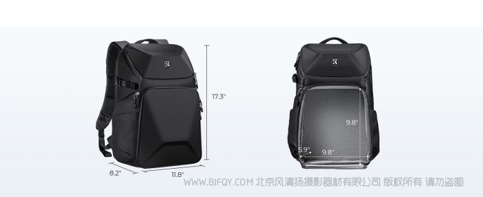开放式设计,上下两侧有两个全开口。左右各设有一个插袋,可存放三脚架和水瓶。