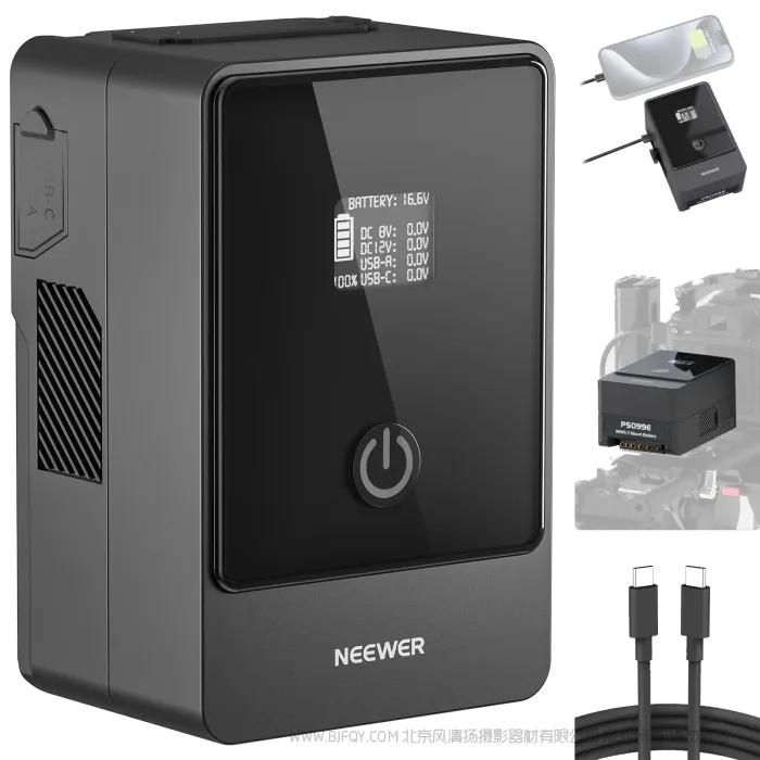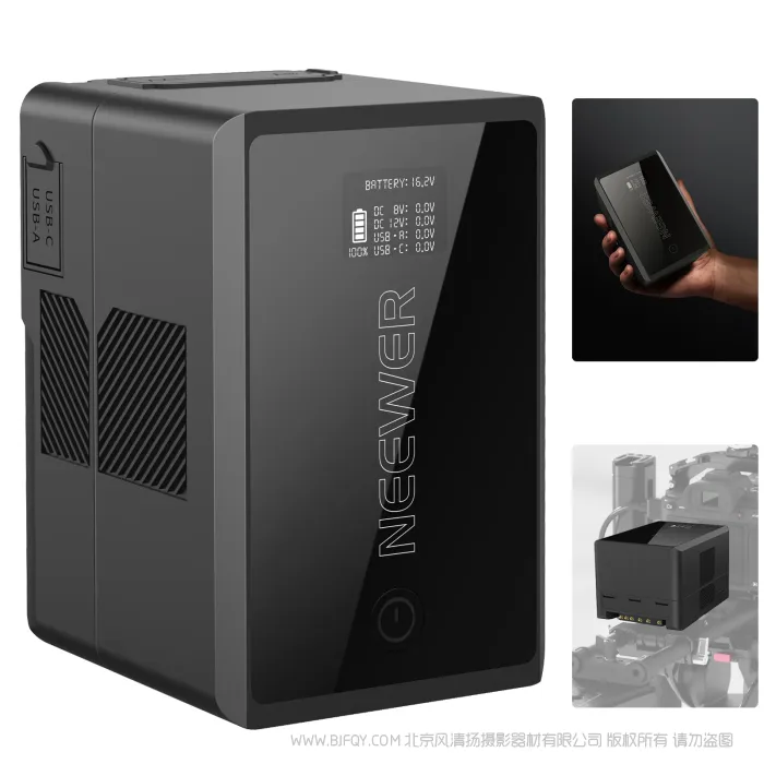 - 具有多个端口的 V 型安装电池 - 以恒定输出功率(总功率高达 100W)同时为多个设备充电。双USB A和USB C,5.5x2.1mm DC 8V和5.5x2.5mm DC 12V端口,BP和D Tap接口与Canon Sony Nikon BMPCC 4K 6K电影摄像机,现场监视器(NEEWER F700/F500,与Atomos ninja v兼容),LED视频灯,笔记本电脑,平板电脑,手机,V型安装电池板(ST43,PS003,PS005)兼容。还配有防尘罩以保护端口