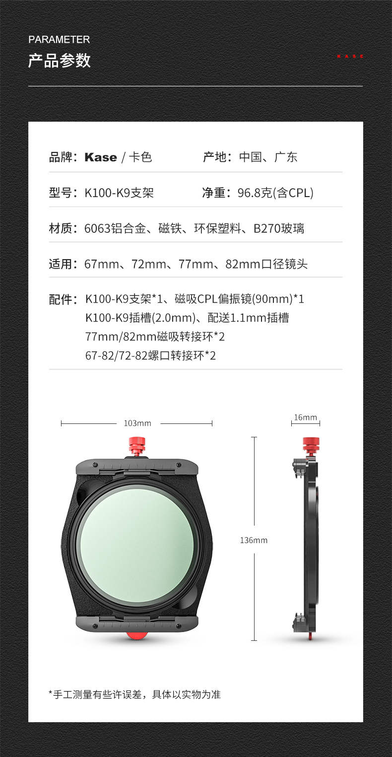 Kase卡色 K100-K9支架套装纤薄滤镜支架磁吸偏振镜方形滤镜方镜架