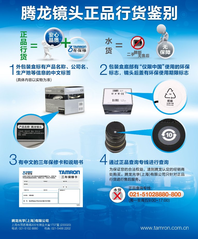 在此,腾龙光学(上海)有限公司敬告广大消费者,为保证您的合法权益,选购腾龙镜头时,请认准购买正品行货。腾龙公司的正品行货镜头,包装内应有简体中文的三年保修卡,包装盒上印有简体中文的产地及品名标签,针对A007(SP 24-70mm F/2.8 Di VC USD)镜头的机身序列号均为激光刻印,不符合以上情况的均为非正规渠道产品。腾龙光学(上海)有限公司只针对正品行货进行售后服务。