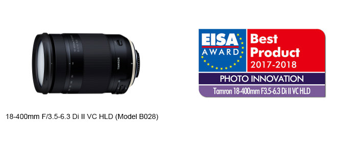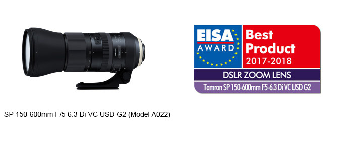 综合光学制造企业腾龙公司宣布旗下两款镜头同时获得2017-2018年度EISA大奖,其中SP 150-600mm F/5-6.3 Di VC USD G2(型号A022)获得"2017-2018年度欧洲数码单反变焦镜头",18-400mm F/3.5-6.3 Di II VC HLD(型号B028)获得"2017-2018年度欧洲摄影创新奖"。