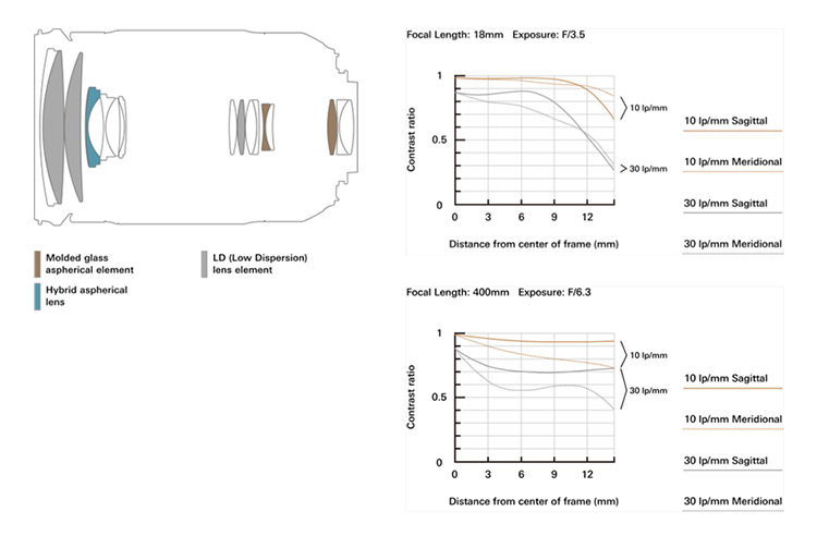 镜头内含11组16片的镜片结构,凭借较新光学设计,LD低色散镜片、玻璃铸造非球面镜片以及复合非球面镜片等多种特殊镜片合理配置于镜头内部,不仅全焦段有效抑制了色差、歪曲色差等色差问题的产生,同时实现了大变焦镜头的良好表现力。镜片群组的合理配置,让长焦端400mm的光学性能和镜头本身大小实现共存。同时,较大摄影倍率1:2.9,在长焦端可获得微距般的摄影享受。