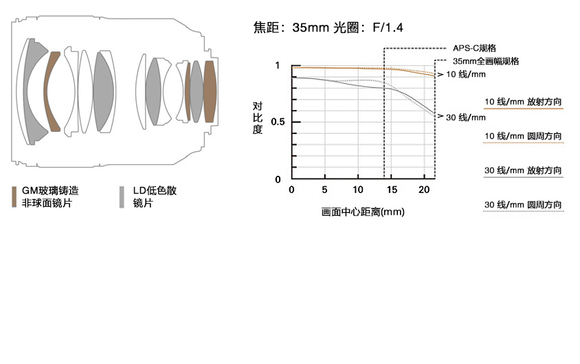 镜片结构10组14片。结合腾龙具有代表技术的光学系统中,毫不吝惜地优化配置了4片LD低色散镜片和3片GM玻璃铸造非球面镜片。较大限度矫正大光圈镜头特有的色差和造成画质下降的各种像差。即使是F1.4光圈全开,也能保证画面中心到周边的高解像力,实现点状图形忠实还原的理想画质。大面积充满魅力的虚化效果,可巧妙烘托出被摄主体的姿态,呈现独特画面表现力。