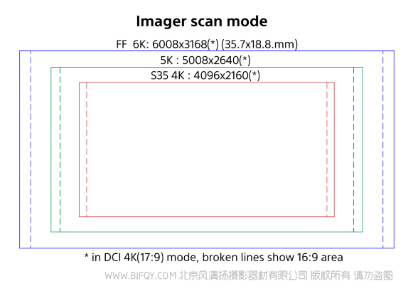FX9 V2.01可以在6K全画幅中的5K区域超取样(如下图绿色画框),实现大画幅4K 60p/50p记录。在升降格方面,用户可以在6K全画幅扫描模式下选择从1fps到180fps帧率的高清格式拍摄