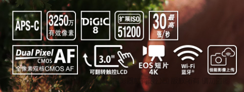 APS-C画幅,3250万像素,DIGIC8处理器,30张每秒高速连拍,3英寸翻转触控屏,4K短视频录制,WIFI蓝牙,黑银双色可选