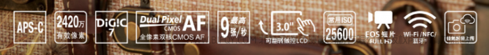 APS-C画幅,2420万像素,DIGIC7处理器,全像素双核CMOS AF,9张每秒高速连拍,3英寸翻转触控屏,WIFI蓝牙都具备,黑银白三色可选