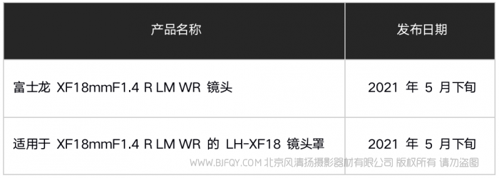 2021年4月15日,富士胶片荣誉宣布将发售富士龙XF18mmF1.4 R LM WR镜头(以下简称“XF18mmF1.4”),预计于2021年5月上市。这是富士胶片X卡口镜头系列的第39款可换镜头,具备27mm(35m等效焦距),较大F1.4光圈,专为X系列无反数码相机设计。