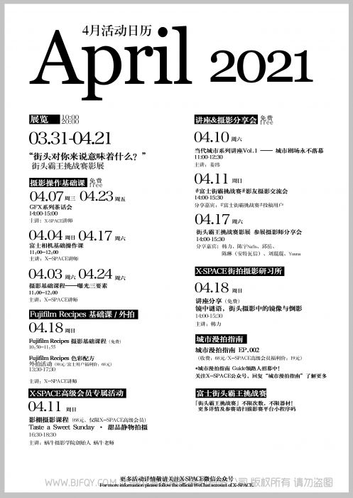 为了更好地让观者走进、了解展出的作品,富士X-SPACE从2021年4月开始,特别推出#富士街霸挑战赛#系列活动:4月11日下午,#富士街霸挑战赛#摄影交流会邀请大家一起上台,展示自己的投稿作品,分享街头摄影创作经历;4月17日下午, 6位参展摄影师将现场分享他们独特的街头视野与创作手法;此外富士X-SPACE还邀请著名摄影评论家、策展人姜纬老师及街头摄影师韩力老师推出专题摄影讲座,助力大家“勇攀擂台”。欢迎通过官方微信公众号“XSPACE富士影像共享空间”了解更多活动资讯及报名,同时公众号也在每周分享此次赛事精选投稿作品,欢迎关注和参与。