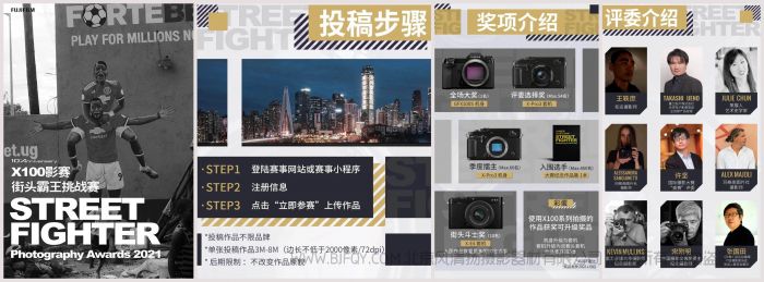 除了极具权威的评委阵容和高规格的奖品池,“2021富士X100系列十周年 街头霸王挑战赛”还首次创新启用擂台赛赛制,横跨春夏秋三季举办共3轮擂台赛,直至2022年1月较终评选决出全场大奖,夺擂、守擂将上演一场精彩“厮杀”,欢迎广大摄影爱好者报名参赛。报名及更多信息敬请浏览赛事官网:https://x-space.fujifilm.com.cn。
