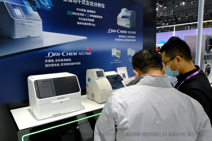 在疫病防控工作中,生化分析是临床诊断的重要方式之一,相较于传统湿生化所必须的液态试剂准备和仪器水液清洗等流程,干式生化凭借启动迅速、流程操作简便、检测结果快速准确,更适合于疫情突发初期要求高时效性的第一线医院的急诊。曾在疫情初期发挥重大作用的全自动干式生化分析仪FUJI DRI-CHEM NX500i此次也亮相展会现场,通过与血液分析、体液分析等诊断相结合,可用于判断患者发热是由细菌、病毒还是其它原因引起,从而提示是否有必要进行进一步的PCR检测,在疫情初期PCR检测流程尚未成熟的阶段有效助力全国各地医疗机构进行发热患者的初步检查。与此同时,较新一代产品NX700i也一同亮相CMEF,与参观者见面。