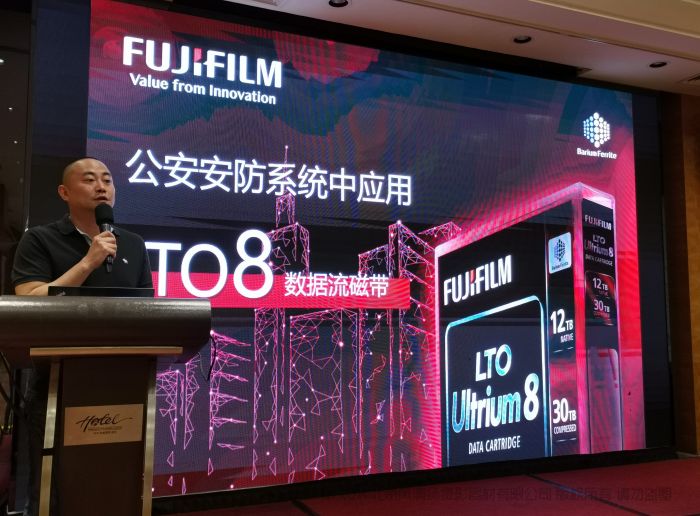 会上,富士胶片(中国)投资有限公司记录媒体事业部总经理骆琤进行了“公安安防系统中应用富士胶片FUJIFILM LTO8数据流磁带”的介绍,对“基于钡铁氧体BaFe技术的富士胶片FUJIFILM LTO8数据流磁带”的研发情况和产品主要技术性能做了详细介绍。