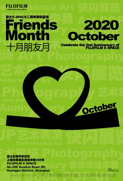 富士影像共享空间X-SPACE将于2020年10月起隆重推出 “十月朋友月”活动,呈现“HELLO FROM GASBOOK” 及“精神车间”两次Pop-Up快闪展览、多场艺术讲座,还为富士X-SPACE 会员及广大热爱影像艺术的小伙伴们准备了影像输出福利及“一次特别的夜拍”活动,“呼朋唤友”共同庆祝富士X-SPACE成立2周年。