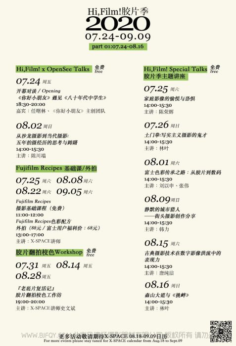 在第二季“Hi,Film!”胶片季活动期间,还设有多场互动分享会和外拍课程: 8月2日,独立摄影师陳川端将在现场分享五年来的拍摄经历以及对于摄影与影像的思考;胶片时代的富士胶片彩色冲印专家刘以申老师将与当代摄影人们一起聊聊富士色彩;在摄影圈掀起话题的大型征集活动“500人富士一次性胶片相机漂流创作计划”作品展览将在第二季“Hi,Film!”胶片季正式落地展出;还有湿版摄影讲座、“老底片复活记”胶片翻拍活动、“Fujifilm Recipes”外拍等精彩纷呈的同期活动…欢迎关注“XSPACE富士影像共享空间”官方微信公众号,同步获悉较新资讯和报名方式。