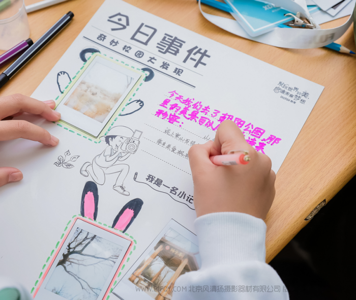 视觉板报是富士instax提案的综合性创作形式,由即拍即得的instax一次成像照片作为主体、运用文字和绘画进行情感表达。与手帐、手抄报和黑板报不同,视觉板报不拘泥于固定的选题和表达,是用来即刻记录每天身边美好事物的板报,运用即拍即得的照片结合绘画丰富画面,再用精炼的文字记录看到的有趣事物,描绘即时的心情,更注重对生活的所思所想。作为课外实践活动的一种形式,视觉板报的制作着眼于艺术性和创造性的综合打造,涵盖摄影、美术、语文等学科,帮助实现学生跨学科综合能力的提升。