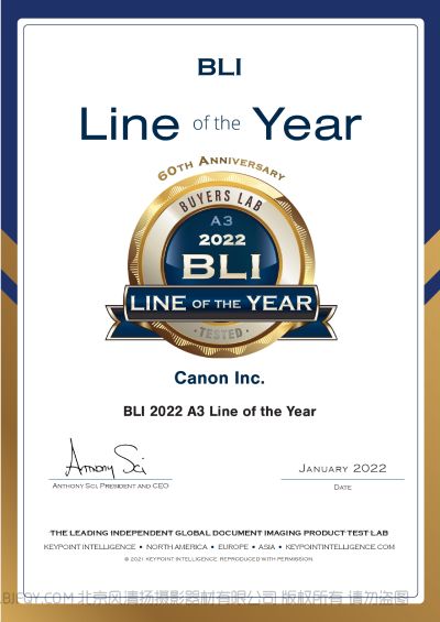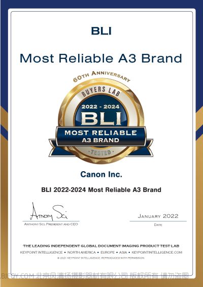 日前,佳能*1多功能数码复合机imageRUNNER ADVANCE DX(以下简称:iR-ADV DX)系列产品凭借出色的性能表现和稳定可靠、快捷高效等多项优势斩获由国际权威测试认证机构Keypoint Intelligence*2颁发的买家实验室*3(以下简称:BLI)“BLI 2022 A3产品线年度奖”(BLI 2022 A3 Line of the Year),这也是佳能在过去七年中第五次获得A3 产品线年度奖。同时佳能还获得了“BLI 2022-2024较值得信赖A3品牌奖”(BLI 2022-2024 Most Reliable A3 Brand)。