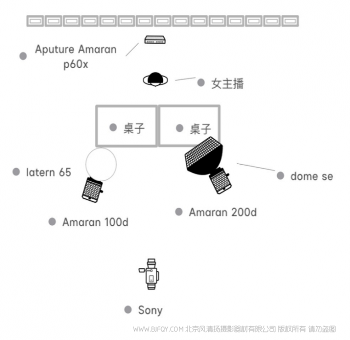 正前方是有两盏方形补光灯,上前方有两盏抛物线射灯,左右各有一盏方形灯。正前方是为了给主播足够的光源,让画面更加清晰。上前方的两盏网格栅射灯,让光线不是硬光会更加柔和。