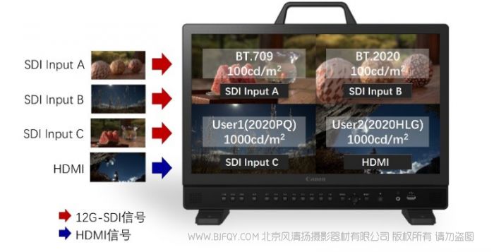 SDI/HDMI多屏显示,可以同时显示多达四台使用不同信号格式的摄像机画面