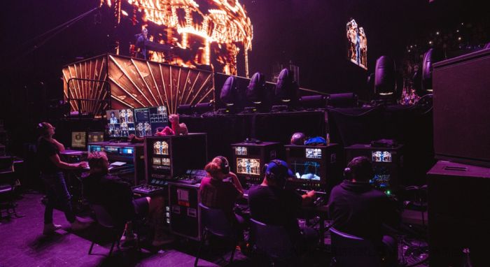 作为巡演视频装备的一部分,Merser专门使用来自PRG的5mm LED面板。“我不想要投影。”他解释说,“我们在舞台两侧安装了16x9屏幕,在舞台上是纵向屏幕,还有一个中央LED墙,因此可以把现场图像发送到每个屏幕上。”