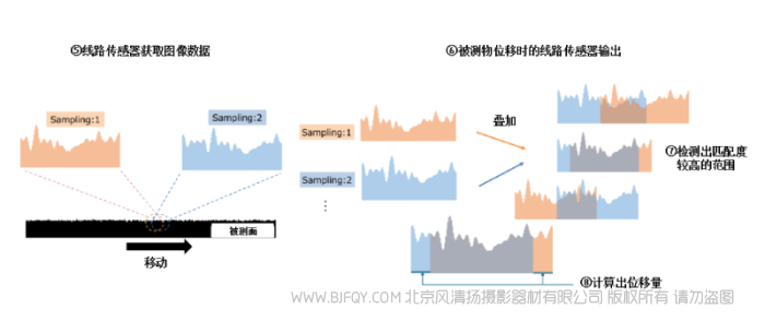 线路传感器连续获取测量对象的一维图像⑤。随着物体的位移,得到的图案会发生变化⑥。根据图案之间的差异检测出高匹配度的位置⑦,提取出每个图案的特征点并叠加,再根据由此产生的差异来计算移动量和速度⑧。