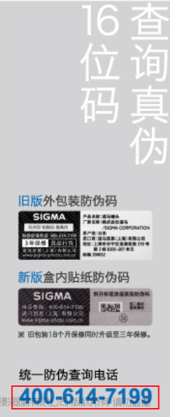 由于我司前期对防伪查询码的供应商进行了变更,导致现有市面流通的防伪查询码上印刷的4006147199的查询电话无法正常使用。目前我司已将该400防伪查询电话停用。用户只能通过刮开防伪码涂层扫描二维码,查询产品的真伪。如对上述内容仍有疑问的,可拨打4008528080适马官方售后服务电话咨询。
