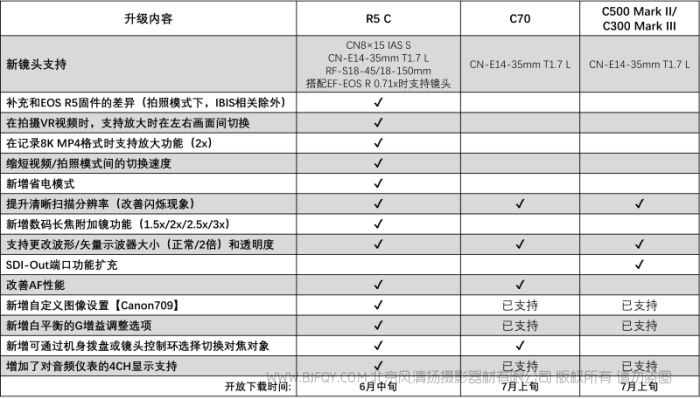 伴随“FLEX ZOOM LENS”系列电影镜头产品阵容的扩充,佳能同步发布了CINEMA EOS系列摄像机的固件升级计划,进一步提升其性能及应用优势,为用户创造更多价值。