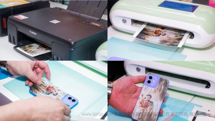 在展会现场使用佳能腾彩PIXMA 6色加墨式照片打印机G580和经纬线切膜机制作手机背膜