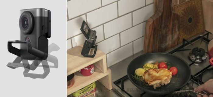考虑到随身携带三脚架比较麻烦,机身设计增加了内置支架,可以在-30º到+30º的角度范围内进行调节(机身垂直放置时,角度视为0º),无需三脚架即可进行低角度仰视拍摄和高角度俯瞰拍摄,适合与朋友自拍合照或是一人独自在外录制视频。