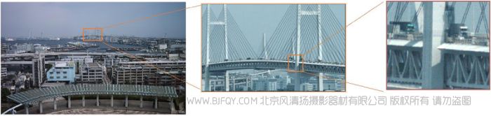在使用了佳能LI8020SAC的监控画面中,可以放大广角图像以看到远处的码头和过桥的汽车