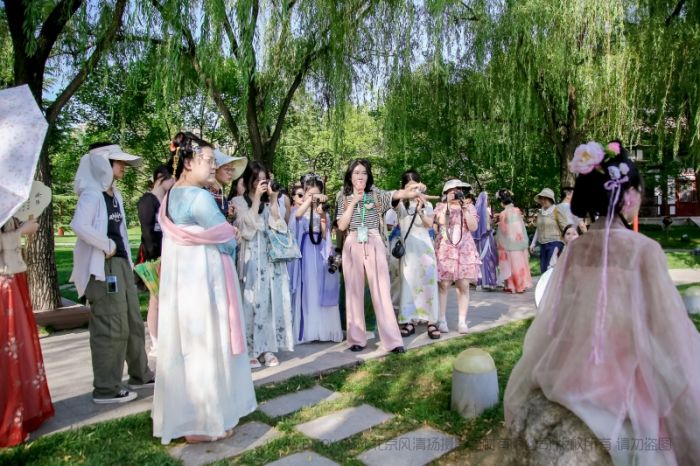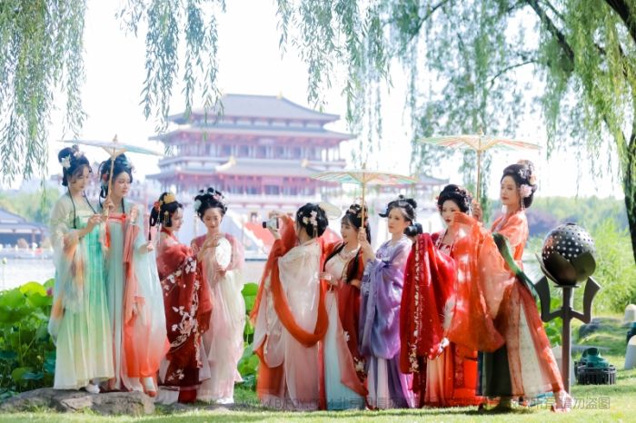 华服女生们在特邀摄影老师的带领下学习摄影知识,在大唐芙蓉园采风