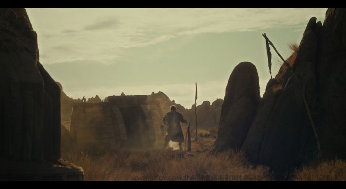 Langdon在他与Hellmuth的基础上把该片的视觉效果提升到了新的高度。“我在早期借鉴了Will喜欢的《星球大战》中的塔图因外景效果。”Langdon解释道,“以他们拍摄的时间来拍摄,以Will的取景来构图,的确呈现出了那种西部感觉,而后期制作设计和色彩的冲击又让影像显得更现代和科幻。色彩对比度也帮助很大。比如,我群组风格中的‘色相对饱和度’可以让我把天空的青蓝更突出一些。”
