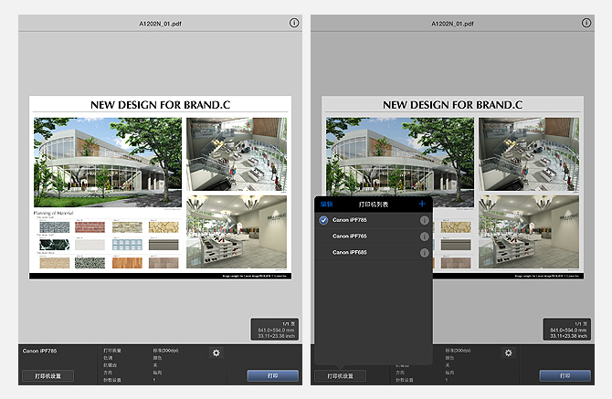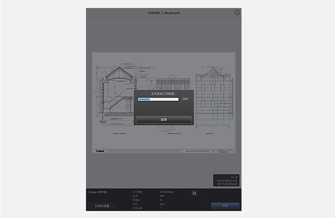 | *1:为连接到佳能大幅面喷墨打印机(imagePROGRAF),打印机需要联入无线网络 *2:如果PDF文件尺寸超出了打印机设定的打印纸张尺寸,打印机将无法正常打印 |
