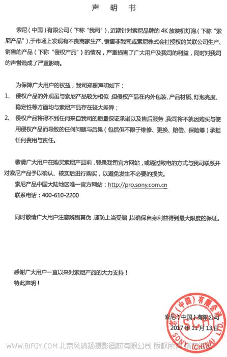 索尼针对市场上 出现假冒的4K放映机灯泡 声明书 公告书