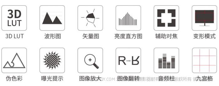 * 全波形显示、波形图、矢量图、RGB直方图、亮度直方图、辅助对焦、斑马纹、中心标记等功能,能帮助准确对焦和曝光,适用于前期拍摄、后期制作以及颜色校准