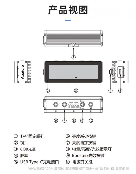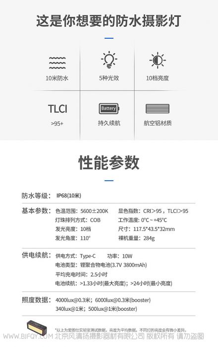 | 基本参数 | 色温范围 5600±200k s色显指数 CRI>95 TLCI>95 灯珠排列方式 COB 工作温度0℃~+45℃ 发光亮度 10档 尺寸 117.5-43.5-32mm 发光角度 110° l裸机重量 284g |