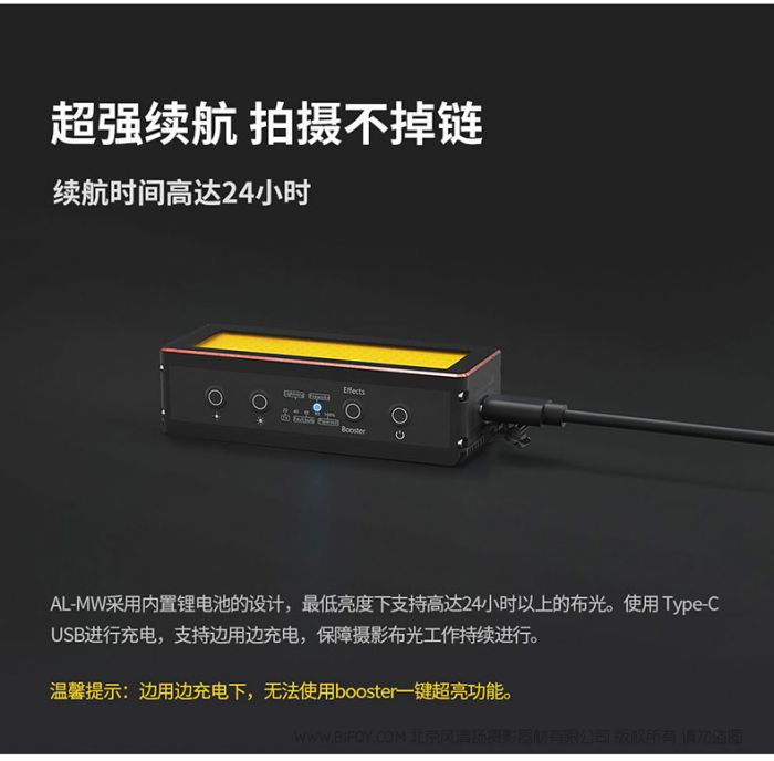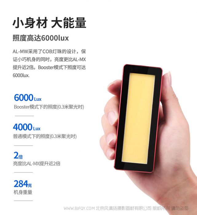 AL-MW采用COB灯珠的设计,保证小巧机身的同时,亮度更比AL-MX提升近2倍.booster模式下照明可达6000lux
