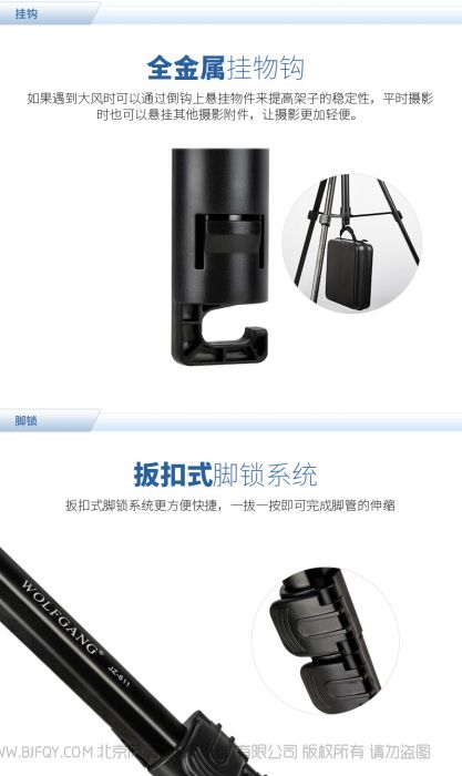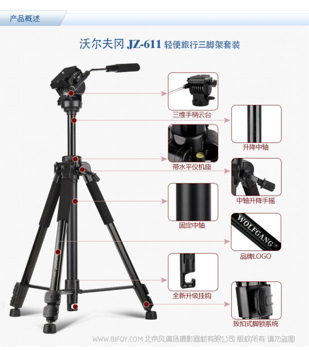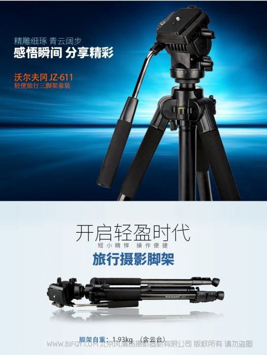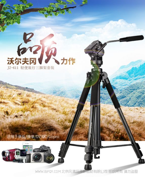沃尔夫冈 JZ-611 轻便旅行三脚架套装 品质力作 适用于单反/摄像机, 高度168CM , 云台可拆卸 2020 新品三脚架