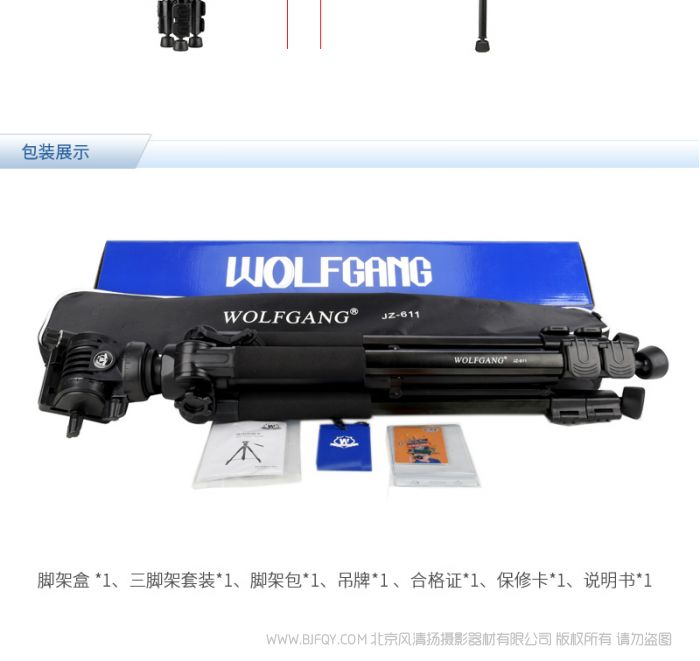 | 原厂标配 | 三脚架套装1 脚架包1 吊牌1 合格证1 保修卡1 说明书1 |