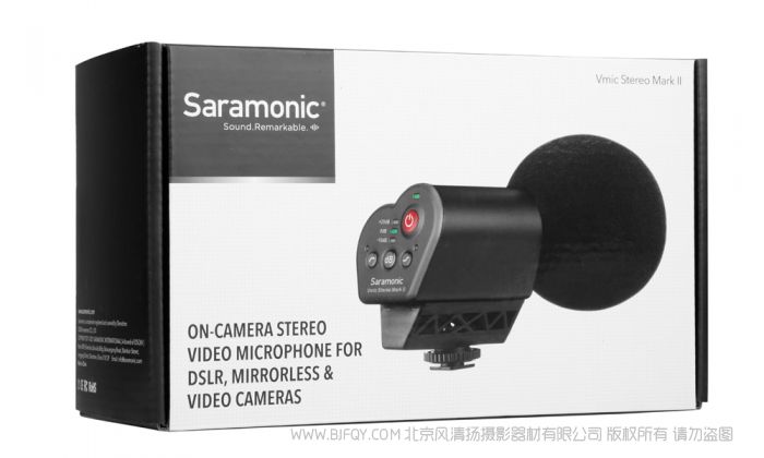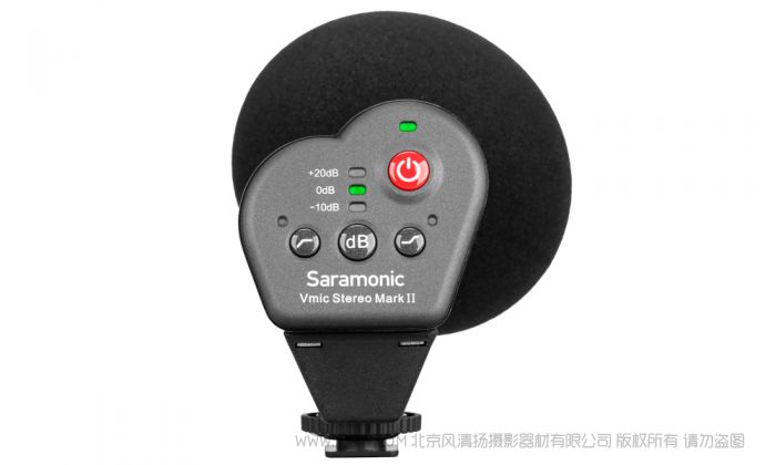 Saramonic Vmic Stereo Mark II是一款立体声相机电容式麦克风,可为DSLR,相机,摄像机提供广播级音质。Vmic Stereo Mark II具有输入电平控制(-10dB,OdB,+ 20dB),高通滤波器(150 Hz)和高频增强(+ 6dB),以提高对话的清晰度。 可拆卸的3.5毫米电缆将Vmic Mark II连接到相机的音频输入,立体声耳机输出使您可以监听输入的音频。 特殊设计的减震架系统可隔离震动和机械噪音。