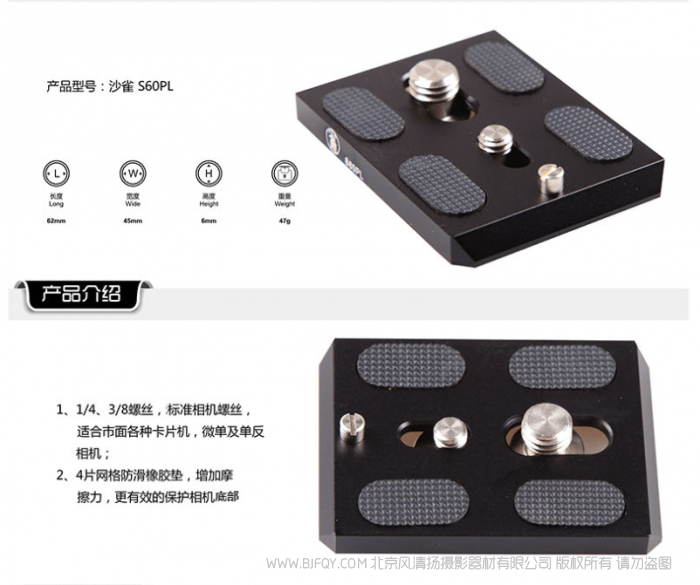 配有2颗螺丝,1/4螺丝1颗,3/8螺丝1颗,长62mm*宽45mm,自重47g,适用于沙雀DV 10,FSB 6T/8T/10T