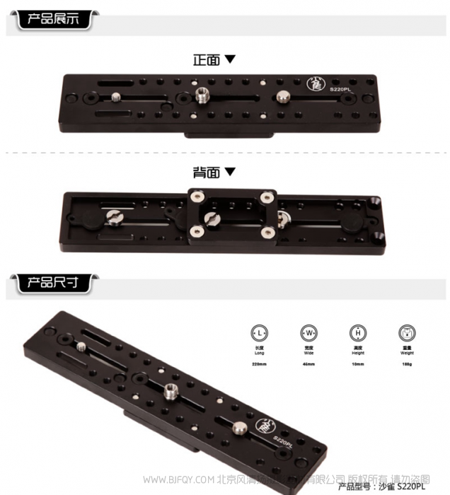 配有3颗螺丝,1/4螺丝2颗,3/8螺丝1颗,长220mm*宽45mm,自重215g,适用于沙雀DV 10,FSB 8T