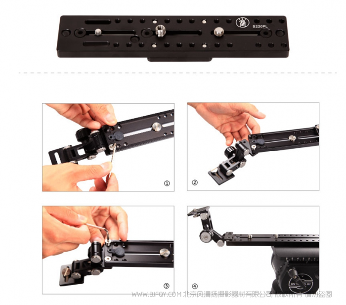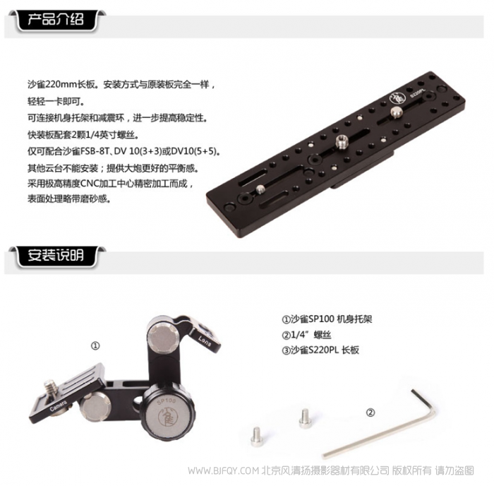沙雀220mm 长板,安装方式和原装板完全一样 轻轻一卡即可.可连接机身托架和减震环,进一步提高稳定性.快装板配套2颗1/4英寸螺丝.
