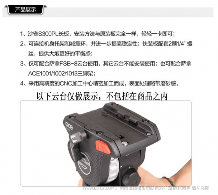 仅可配合萨拿 FSB-8云台使用,其他云台不能安装使用,也可配合萨拿 ACE1001 1002 1013三脚架;