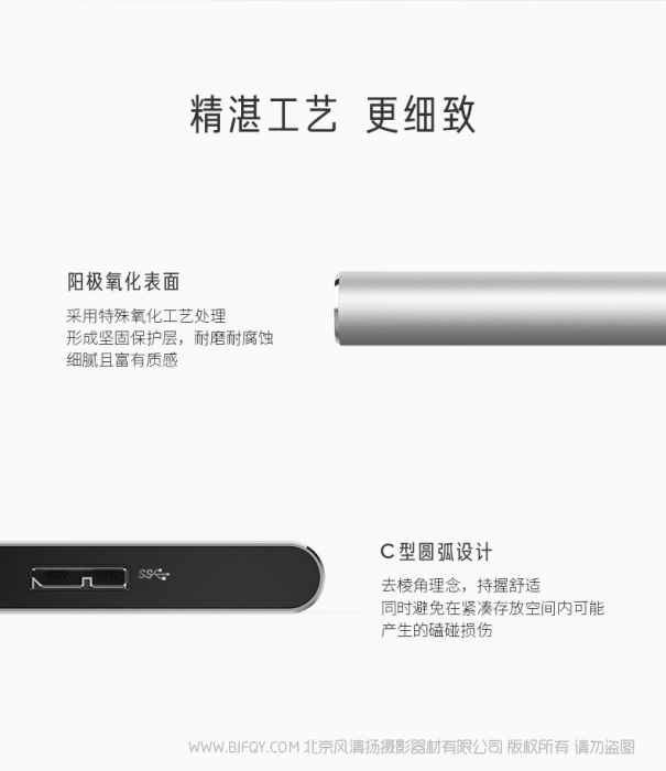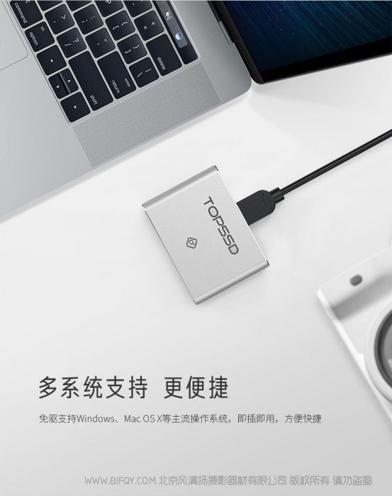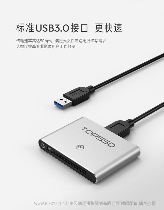 标准USB3.0接口 更快速 传输速率高达5Gbps,满足大文件高速无损读写需求 大幅度提高专业影像用户工作效率