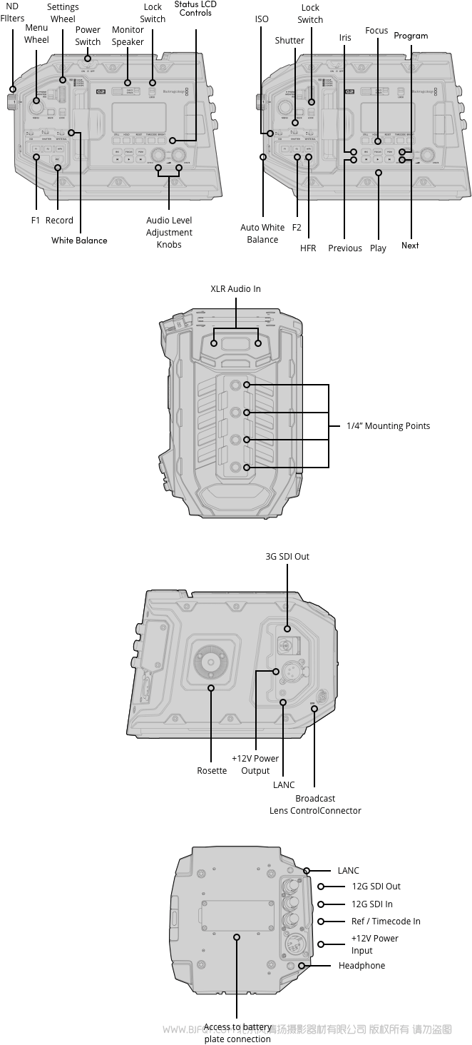 Blackmagic SDI Control Protocol、iPad控制、蓝牙控制、2 x 2.5mm LANC镜头和录制控制。
