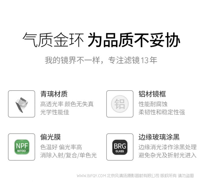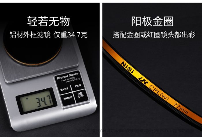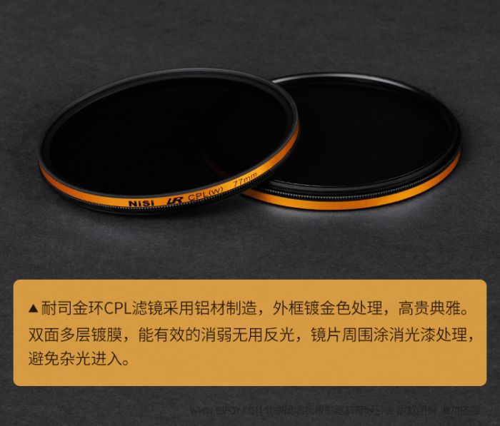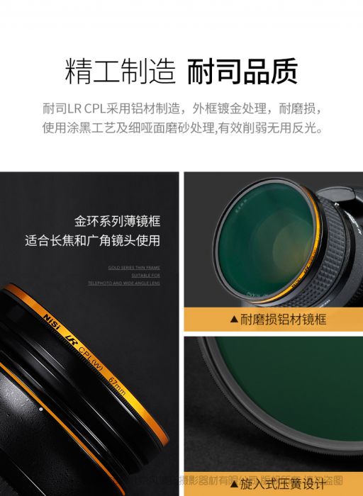 耐司LR CPL采用铝材制造,外框镀金处理,耐磨损,使用涂黑工艺及细哑面磨砂处理,有效削弱无用反光