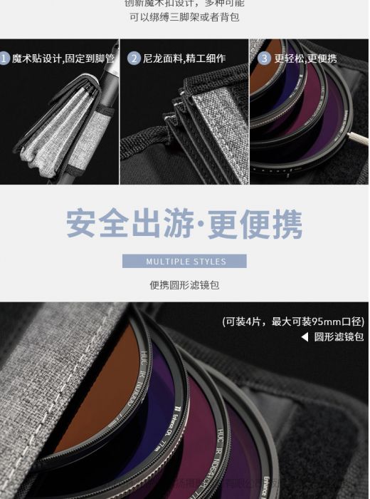 | 150mm方镜收纳一体包 | 150mm | 6971634249698 | ¥- | ¥399.00 | 150系统收纳布袋,可同时装S5或Q系列支架及7片150方镜(3片150x150mm和4片150x170mm) 也可装S5圆镜及S5镜头盖, 风琴式抗震设计,可背可挂在三脚架上,每个内附清洁布, 分区式设计细心呵护滤镜,内开口设计方便拿取滤镜) |