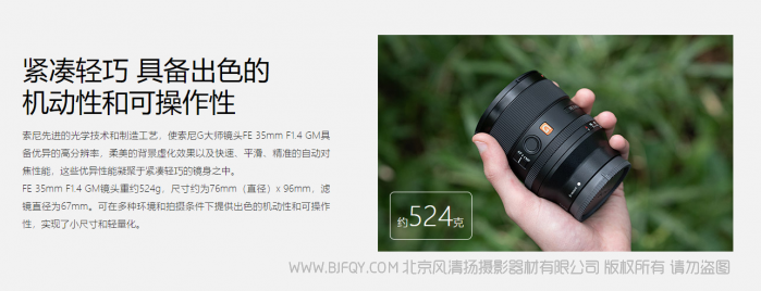FE 35mm F1.4 GM镜头重约524g,尺寸约为76mm(直径)x 96mm,滤镜直径为67mm。可在多种环境和拍摄条件下提供出色的机动性和可操作性,实现了小尺寸和轻量化。