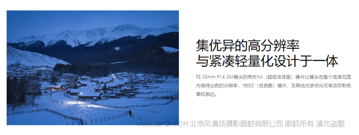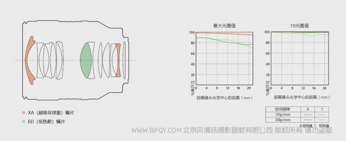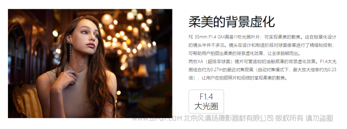 FE 35mm F1.4 GM镜头的两枚XA(超级非球面)镜片让镜头在整个成像范围内保持出色的分辨率,1枚ED(低色散)镜片,及其他光学优化可有效抑制色差和紫边。