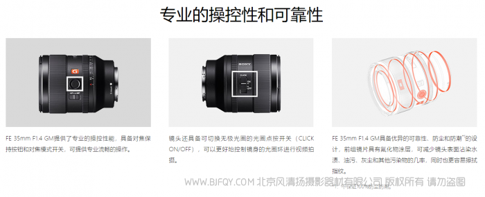FE 35mm F1.4 GM具备优异的可靠性、防尘和防潮*1的设计,前组镜片具有氟化物涂层,可减少镜头表面沾染水渍、油污、灰尘和其他污染物的几率,同时也更容易擦拭指纹。