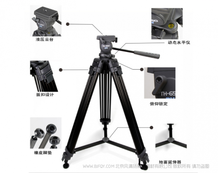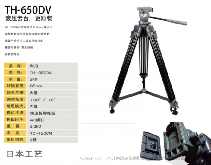 TH650DV 球碗直径 65mm 使水平调整更顺滑并使在斜坡时的调整更稳固平滑采用了二级三节耐用的椭圆形脚管,宽大快速 安装托板